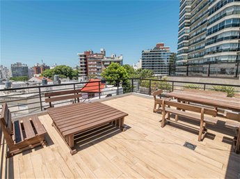 Living comedor con linda terraza, 1dormitorio al frente, baño completo y cocina integrada.