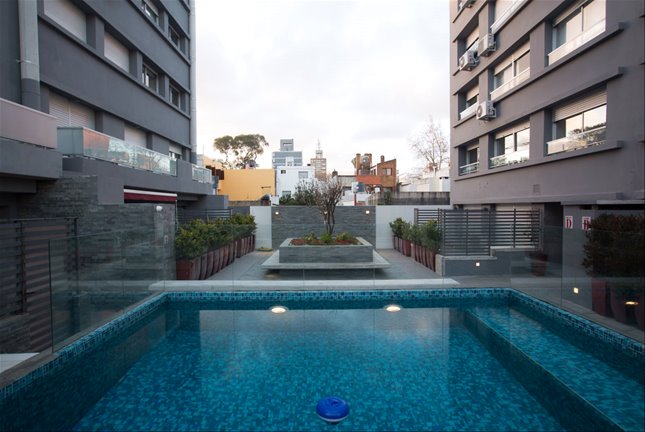 Excelente punto, a mts del World Trade Center y de Montevideo Shopping.Al frente, muy luminoso. Living comedor con amplia terrazaUn dormitorio con placar y salida a la terraza, baño completo y cocina integrada.Calefacción individual por eurocable.El edificio tiene piscina y un patio tipo español muy disfrutable.Barbacoas abiertas con parrillero. Vigilancia presencial combinada con virtual. Gastos comunes 8.342.-PROPIEDAD CON RENTA
